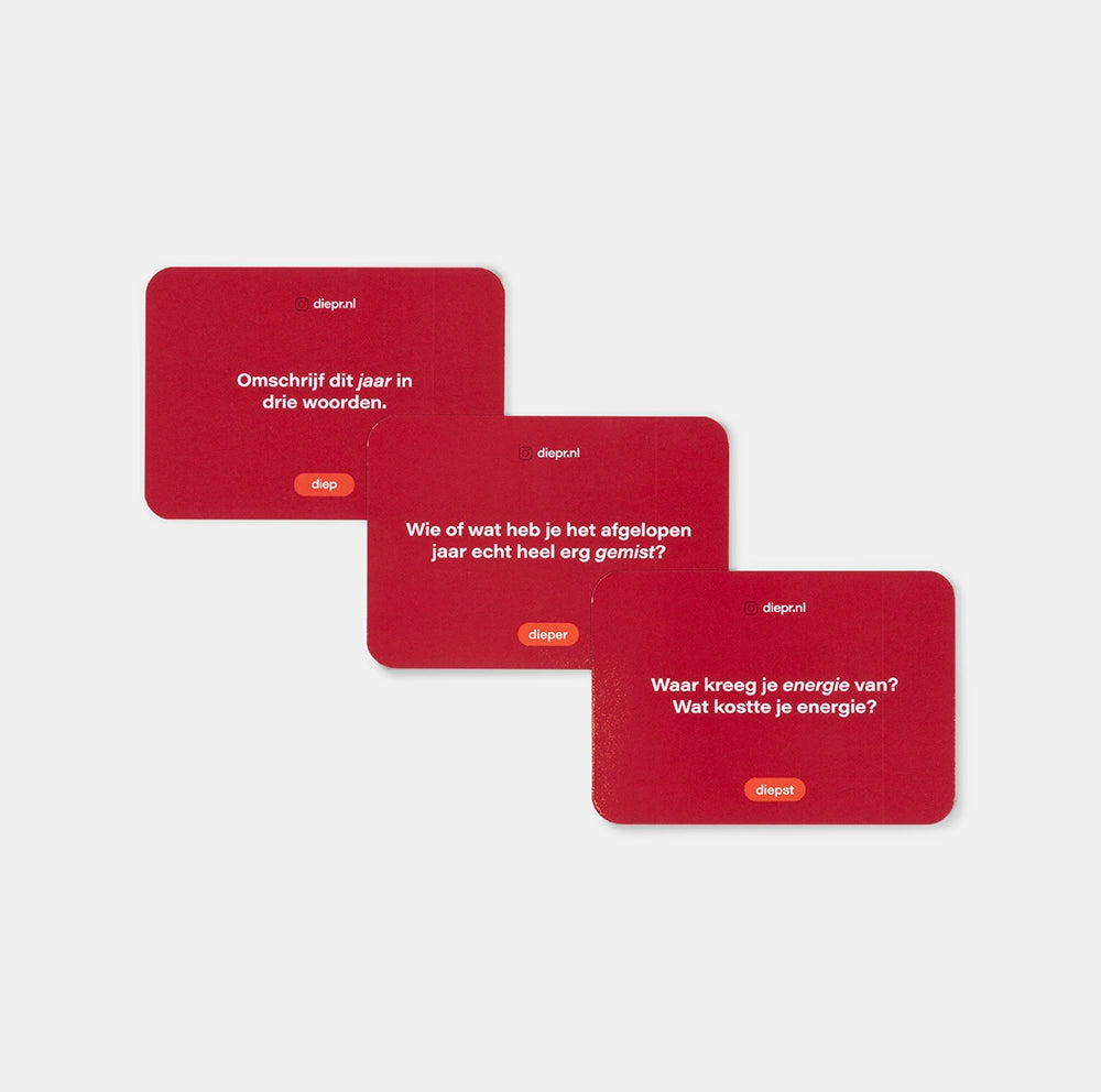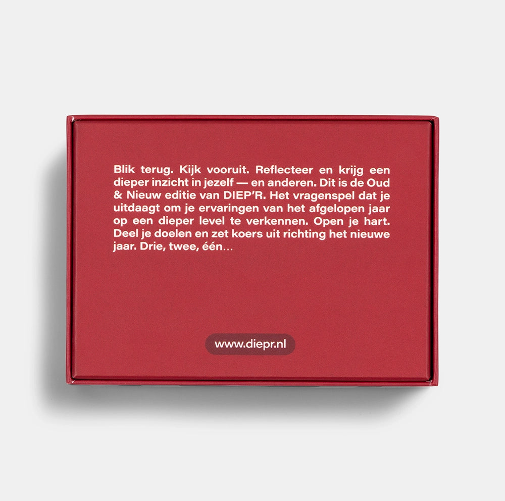 Dit is de Oud & Nieuw editie van DIEP'R. Het vragenspel dat je uitdaagt om je ervaringen van het afgelopen jaar op een dieper level te verkennen.